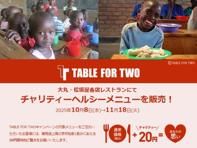 大丸・松坂屋では、秋のTABLE FOR TWOフェアを開催中です。開発途上国の子どもたちへ給食を届けるため、対象レストラン・喫茶にて募金箱の設置をしております。また一部店舗では、秋の味覚を取り入れたチャリティーメニューを販売し、おいしく楽しく寄付活動に参加することができます。