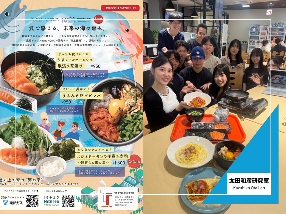 陸上養殖のうるみえび(Niterra AQUA)と知多クールサーモン(東邦ガス)を使った、お茶漬け・ビビンバ・手巻き寿司を、TFTメニューとして11月29日までの期間限定で販売しています。学外の方もご利用いただけます。メニューは、総合政策学部・太田和彦ゼミの3年生が中心となって考案しました。