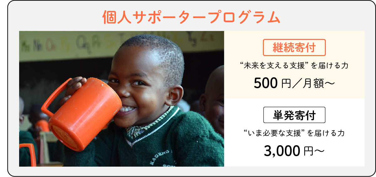 TFTでは皆さまからの寄付により、アフリカ・アジアの子どもたちに給食を届ける「個人サポータープログラム」を募集しております。月500円からの継続寄付、または3000円からの単発寄付も受け付けております。