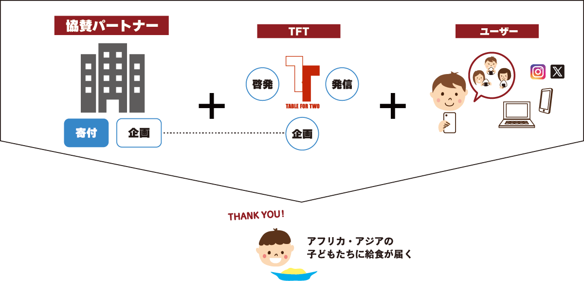 1枚の写真投稿につき、5食分の学校給食(100円)を協賛パートナーが提供します。TFTと連携し、世界の食の不均衡の問題について考え、行動するきっかけつくりを進めます。
